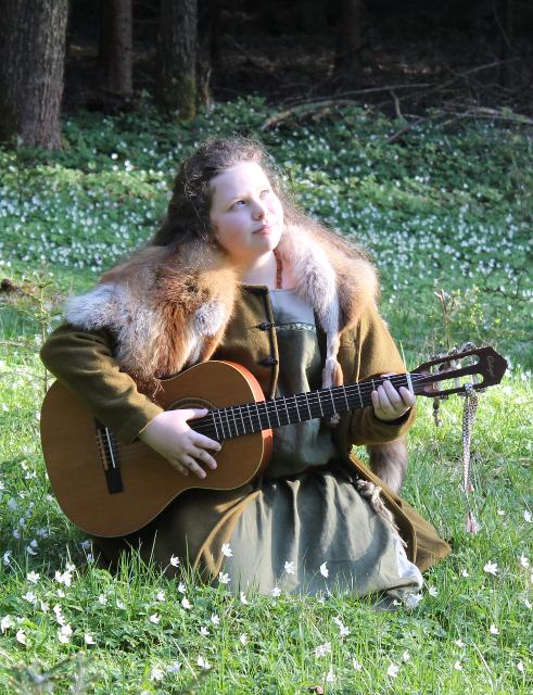 Liebliche Bardin und gelehrig mit Schwert und Stab